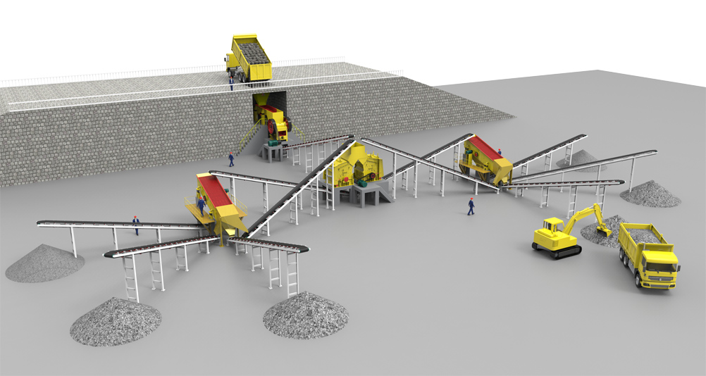 礦石原料通過(guò)振動(dòng)給料機(jī)把物料均勻的送入顎式破碎機(jī)中進(jìn)行第一段破碎,通過(guò)顎式破碎機(jī)出來(lái)的物料再放入反擊式破碎機(jī)進(jìn)行第二段破碎,二次破碎的物料通過(guò)圓振動(dòng)篩進(jìn)行篩分分級(jí),上層大于成品的物料返回反擊式破碎機(jī)繼續(xù)破碎,粒度大小合格的物料根據(jù)大小被篩分成所需的25-16mm、16-5mm、0-5mm等規(guī)格的石料,成品由皮帶輸送機(jī)輸送至成品區(qū)。
