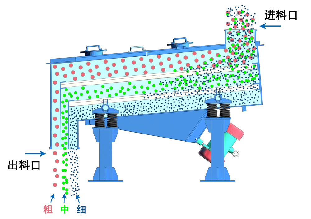 圓振動篩的篩面采用多層網(wǎng)孔,按粒度大小進(jìn)行層層篩分。物料被投入圓振動篩中后,隨著振動器的運(yùn)動,物料會在篩面上產(chǎn)生不斷的滾動和彈跳,以達(dá)到篩分的目的。在篩分過程中,通過不斷的摩擦和撞擊,大顆粒的物料會逐漸在篩面上向外移動,而小顆粒的物料則會逐漸向下通過篩網(wǎng)的空隙。